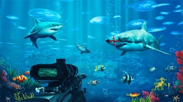 2、开火,在深海中杀死鲨鱼,营救人质,完成购买更强大武器的任务,挑战更可怕的鲨鱼老板。