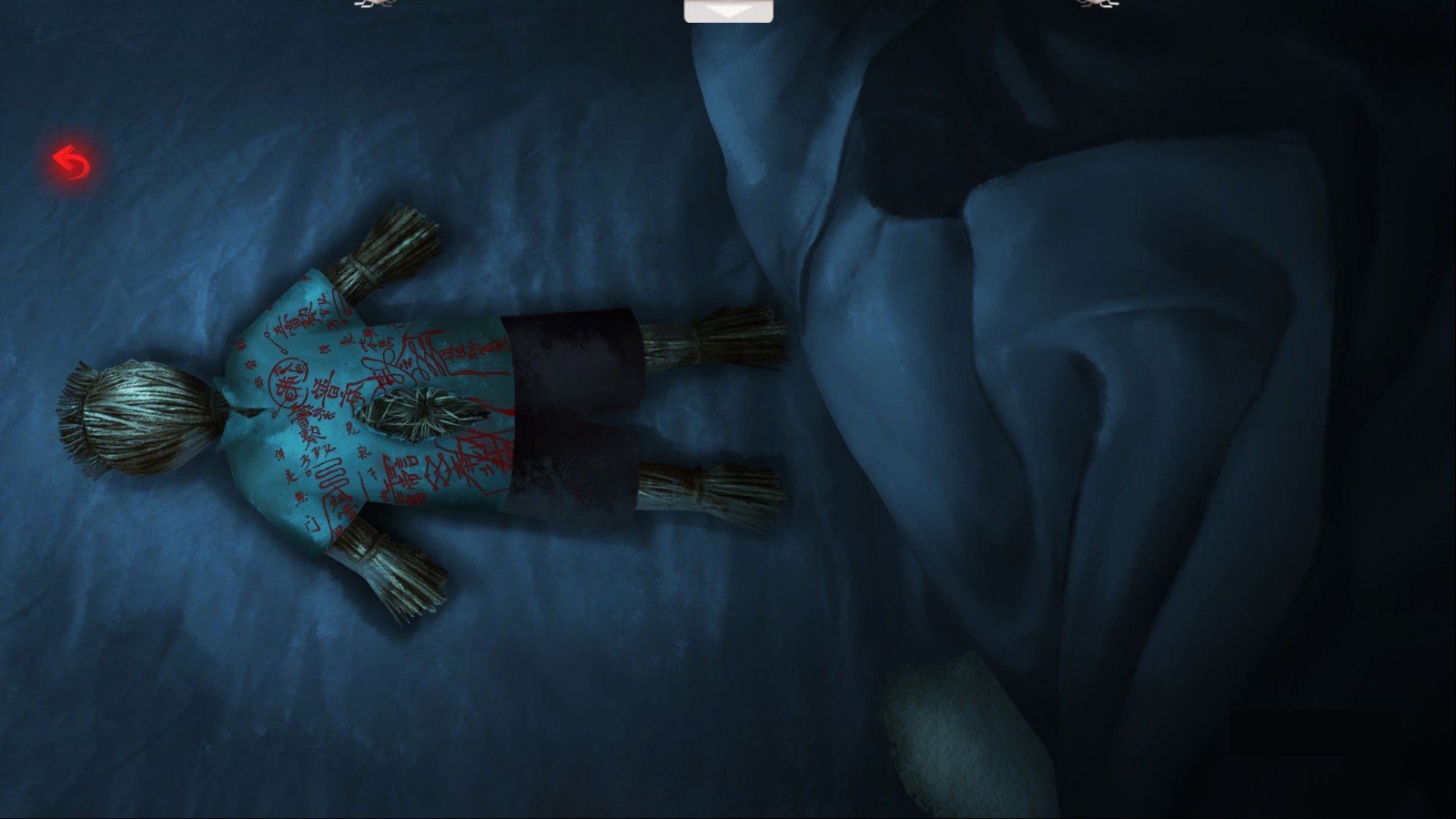 21、向左来到门左边,查看突然出现的纸人和小旺的遗照,向天上的眼睛流血后,从门口出去进入2楼。