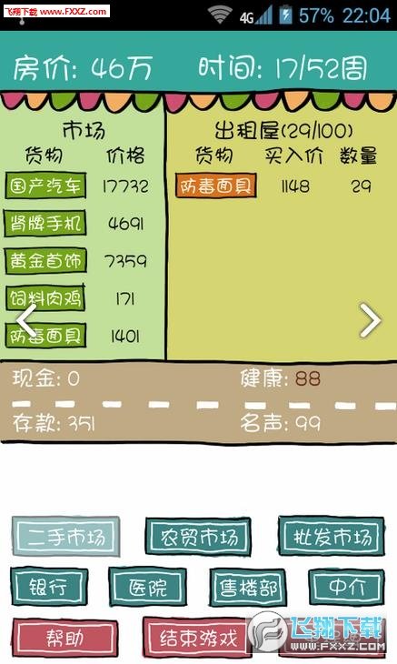 屌丝买房记是一款非常有趣的文字模拟经营类休闲娱乐游戏。游戏玩法很简单,你需要在游戏中通过低买高卖各类道具赚取一定的钱,你每天都可以查看房价的涨幅。通过自己的精打细算,逐渐积累金钱。在游戏中,你要在一年时间内,用仅有的三千块钱赚到几百万甚至几千万,最终买到理想中的房子,你能完成这个挑战吗?简单有趣又不失挑战的文字冒险类游戏,感兴趣的小伙伴们赶紧来下载游戏体验一下吧!