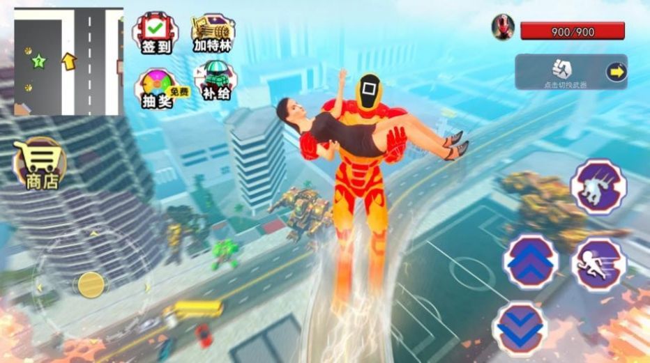 1、3D的游戏画面场景,可以操控战衣在城市间来回穿梭,欣赏四周的美景。