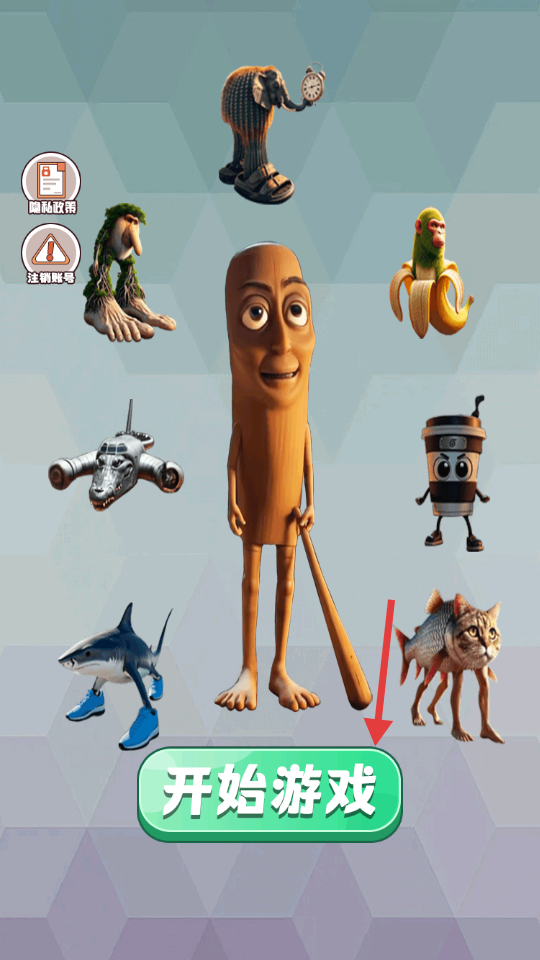 1、主界面浏览异化角色(大象-猴子等)-点【开始游戏】-进入模式选择页-开启躲猫猫之旅。
