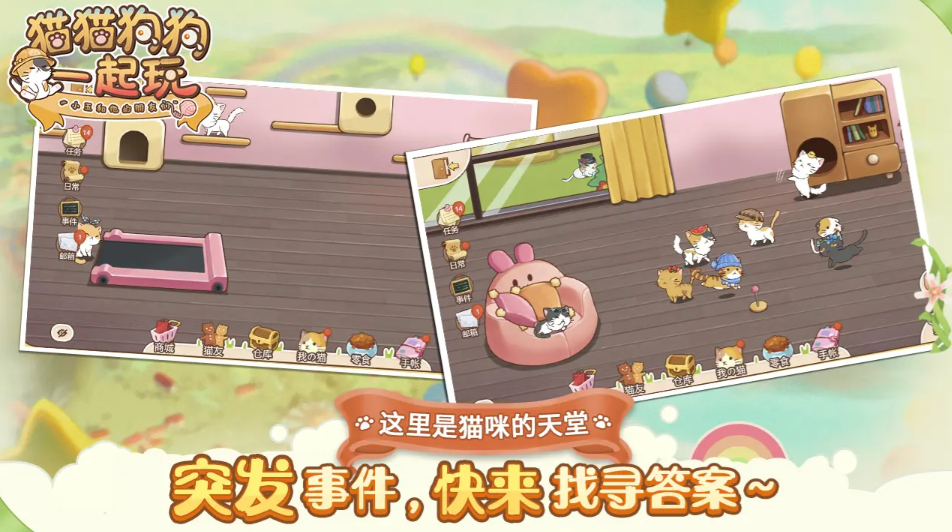 猫猫狗狗一起玩是一款满是治愈感的萌宠互动游戏,在游戏中和性格各异的猫猫狗狗相伴,在花园庭院等温馨场景里互动玩耍投喂零食、投掷玩具还能一起完成轻松任务,解锁可爱装扮打造专属萌宠收集趣味互动瞬间,软萌画风搭配欢快音效在无压力的陪伴中,尽享与毛孩子嬉戏的纯粹快乐。