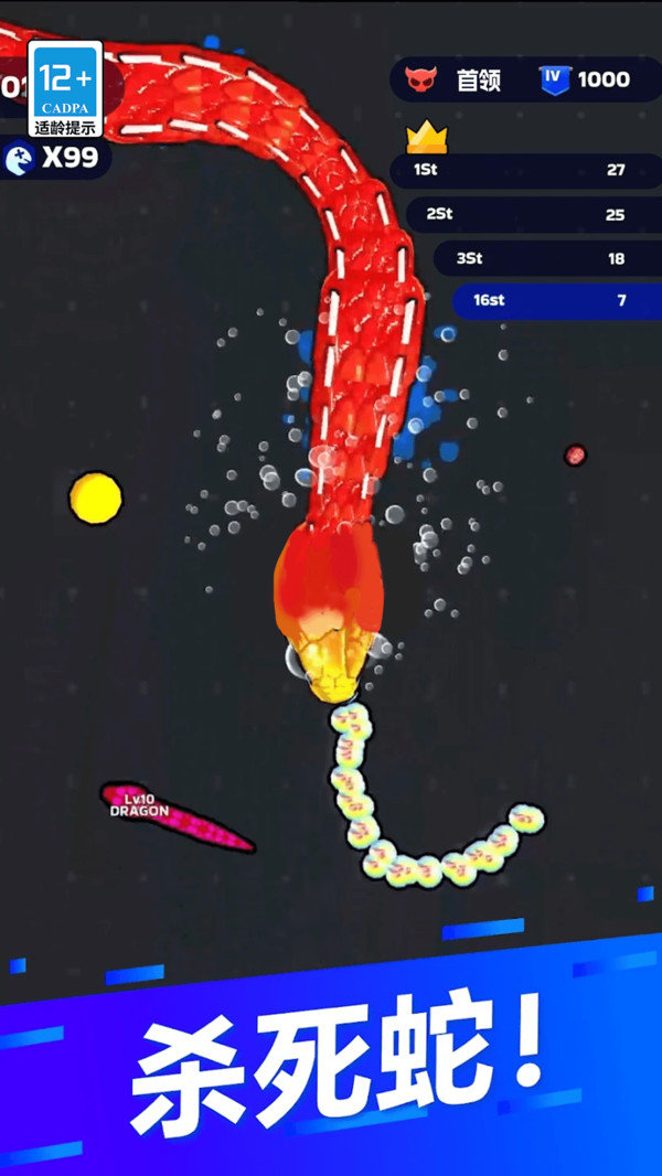4、时刻保持警惕,小心地图上其他比你更大的蛇,一旦你的头部撞上其他蛇的身体,游戏就会立即结束