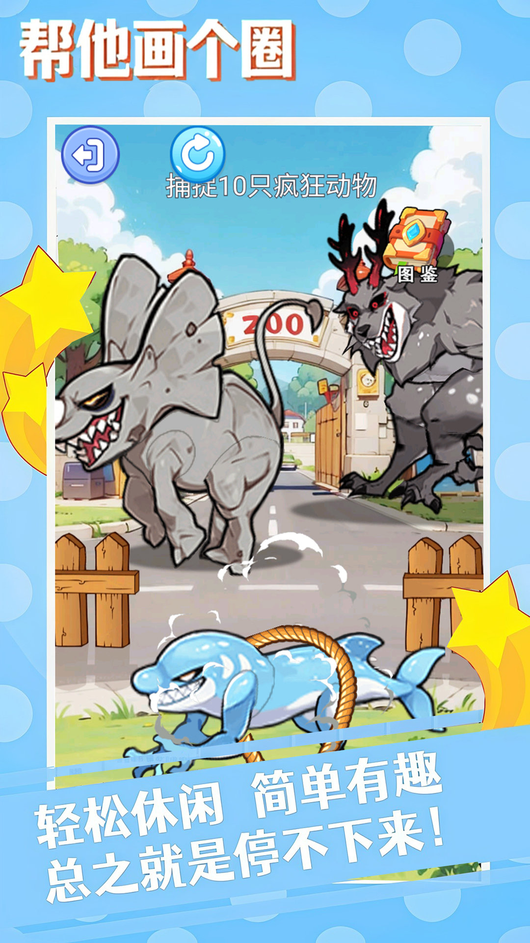 帮他画个圈是一款创意性十足的休闲益智游戏,自由手绘套圈为核心玩法,指尖勾勒任意形状的圈瞄准萌趣动物完成捕捉还能规避障碍应对移动靶挑战,关卡设计巧妙场景丰富多样成功捕捉可解锁动物图鉴,画风清新可爱操作简单易上手兼具创意策略与收集乐趣,轻松解压适配各类休闲场景。