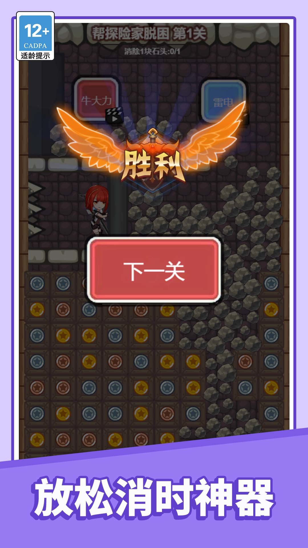 2、消除玩法简单直观,适合碎片时间娱乐,成功解救姐姐后,夸张的庆祝动画,如姐姐欢呼,增强成就感;