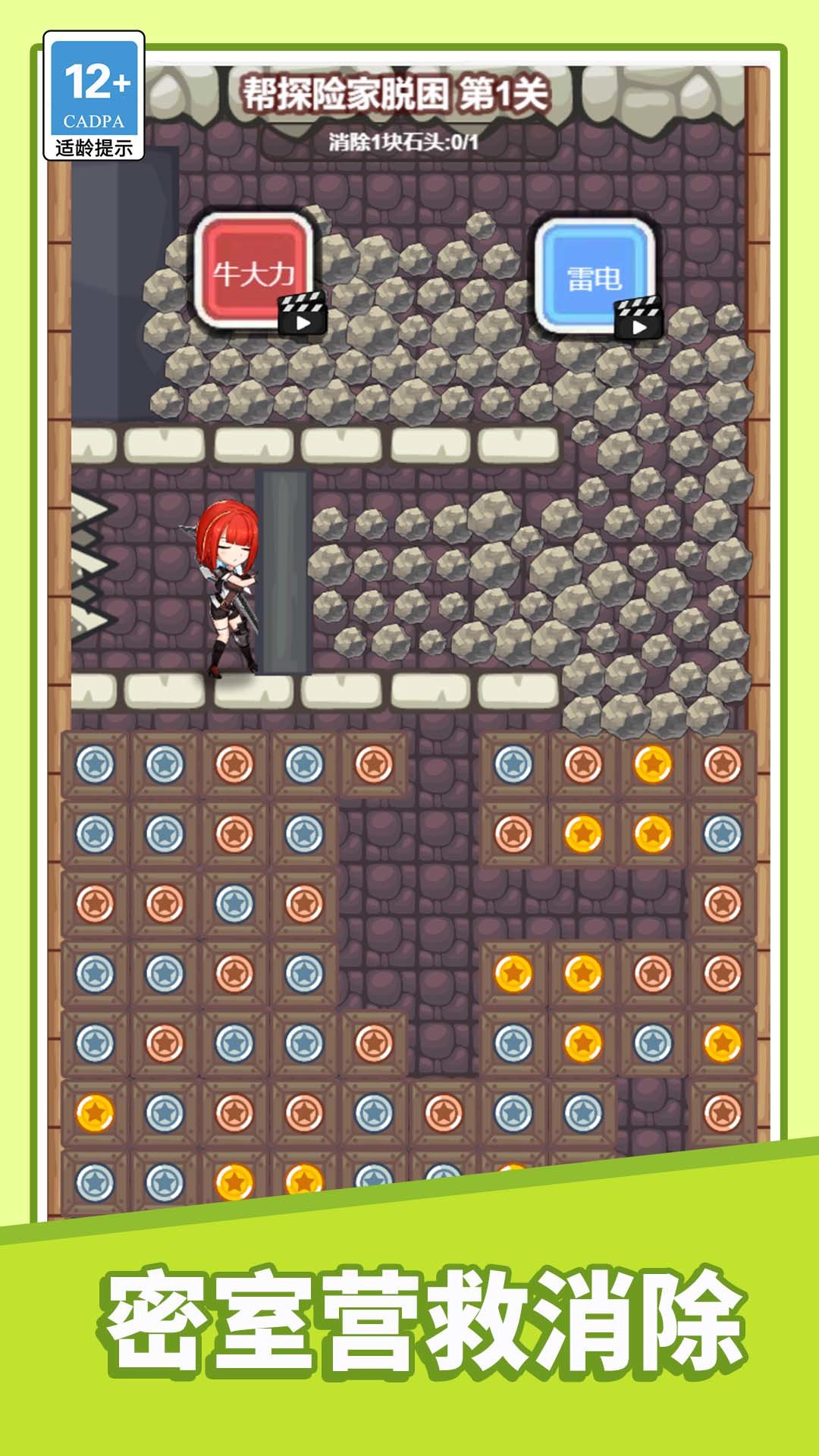 密室救姐姐是一款消除方块完成拯救的休闲闯关游戏,以密室逃脱为框架,玩家需通过消除相同颜色的方块使石头下落,减轻对姐姐的压力,同时结合密室逃脱元素,需破解机关、收集道具。场景中的道具,如钥匙、机关、隐藏线索,需通过观察和逻辑推理获取,加入动态元素,如移动的障碍物、限时机关,增加紧迫感。