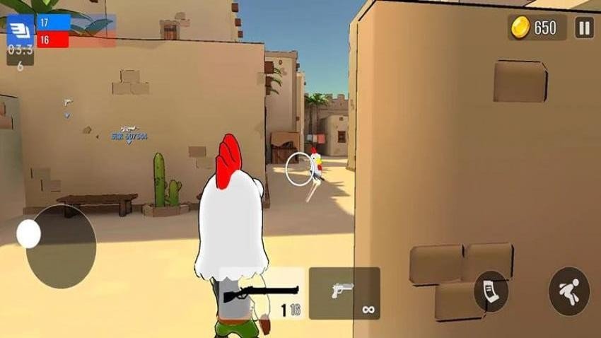 1、选择小鸡角色与初始武器进入匹配,通过虚拟摇杆控制移动,屏幕滑动调整瞄准方向。