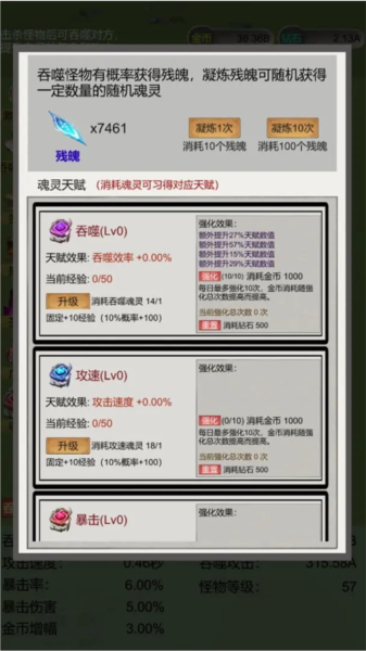 养成:游戏在养成方面也是如同常规割草游戏一样的设定,分为局内和局外两个方面,在局内就是单纯依靠吞噬敌人提升自身属性面板,没什么吸引人的点,而在局外养成则是依靠抽奖来获取碎片以强化一些buff加成来助力玩家的游戏体验,只能说没什么意思,但也的确没什么养成压力,给予玩家的养成体验很轻松。