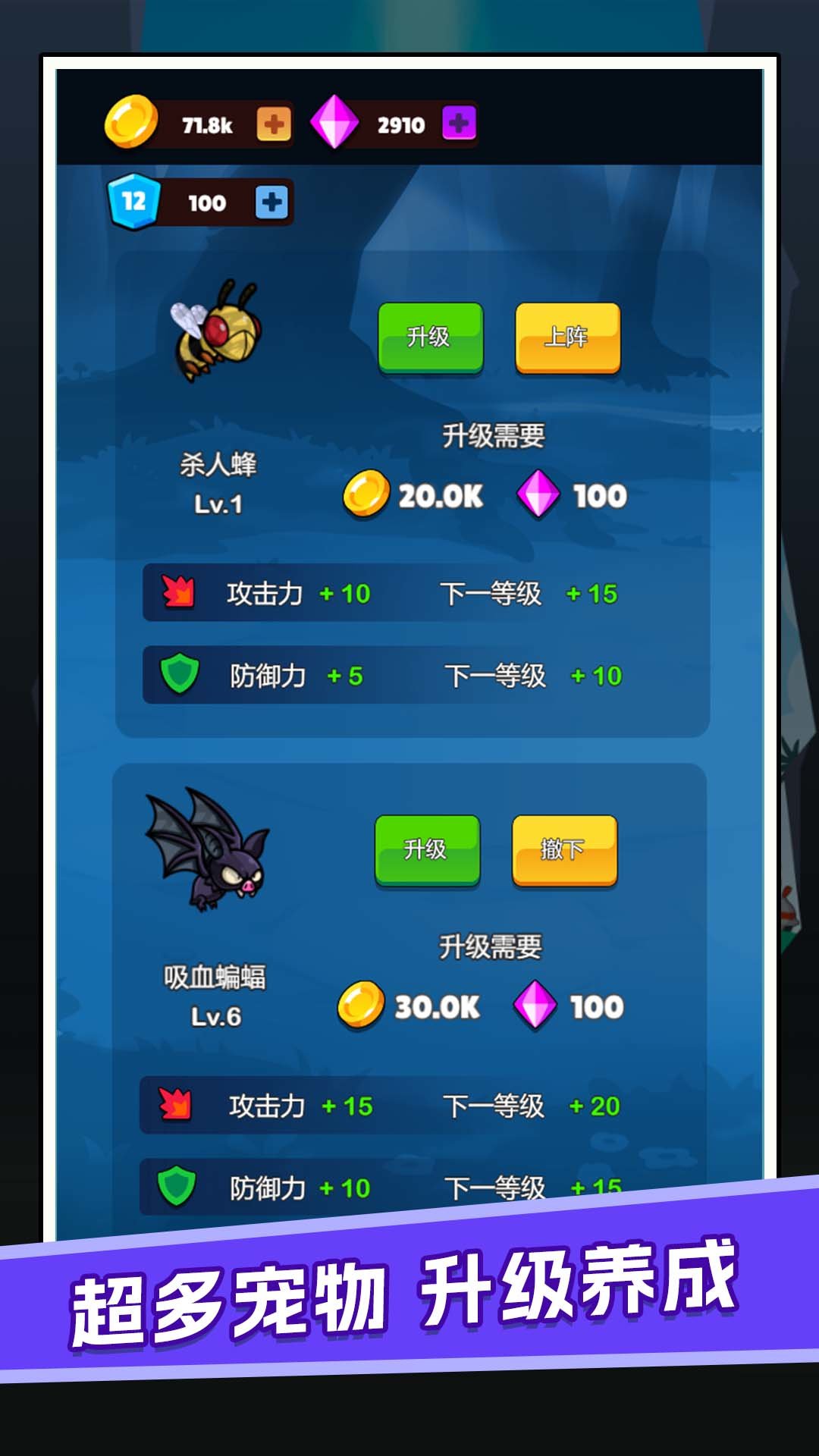 2、点击宠物按钮,玩家可以使用金币购买自己的宠物帮助自己进行战斗,每个宠物的攻击力和防御力不同,玩家按需选择 。