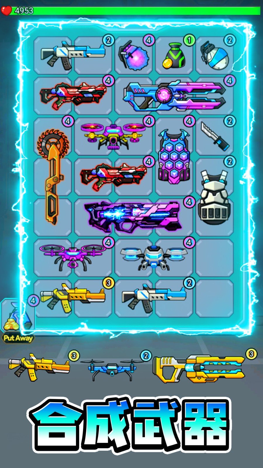 3、放置武器在格子里,相同的武器可以合并升级,一次次的升级州,你的实力会很强。