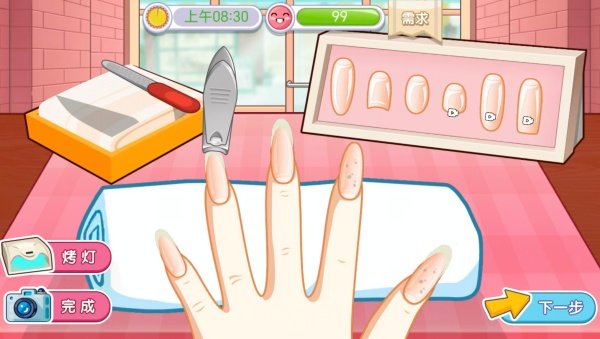 3、进入美甲制作,首先需要用指甲剪将长指甲剪掉并清理干净,然后点击下一步进行后续操作。
