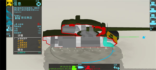 2.点击坦克的特定部位,如炮塔正面或车体侧面,会立刻显示该区域的装甲厚度与倾角数据。