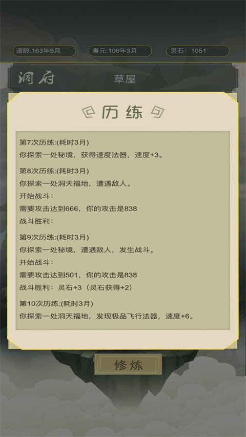 2、开局选择普通天赋或者绝世天赋,勤修苦练打坐吐纳提升修为。