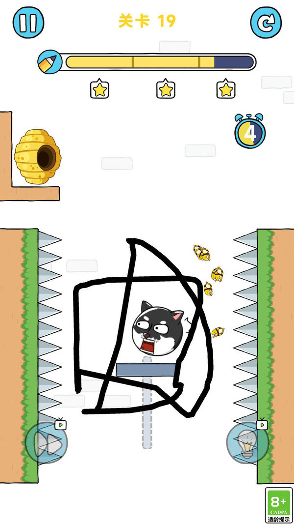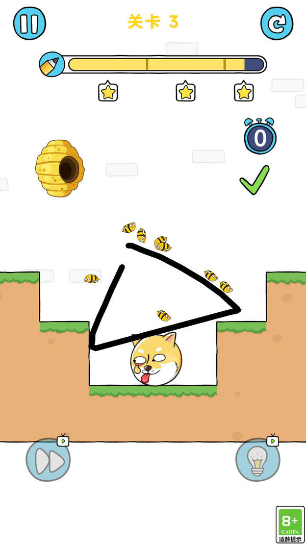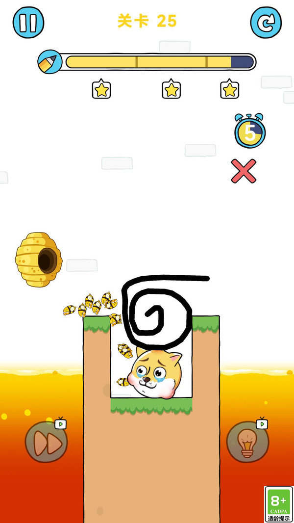 2、你画的线条只要成功的帮助狗狗抵挡住蜜蜂7秒钟,就算是闯关成功了。