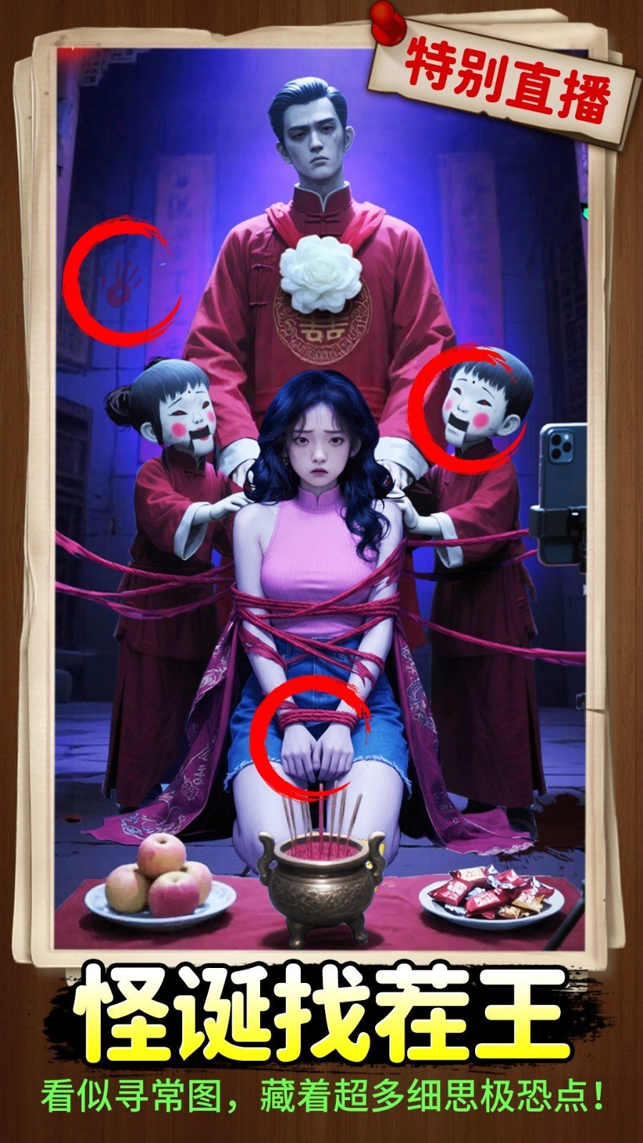 2、依托幽暗光影、悬疑音效构建沉浸式恐怖氛围,环境细节与突发惊吓强化紧张感,让找茬过程始终伴随未知恐惧。