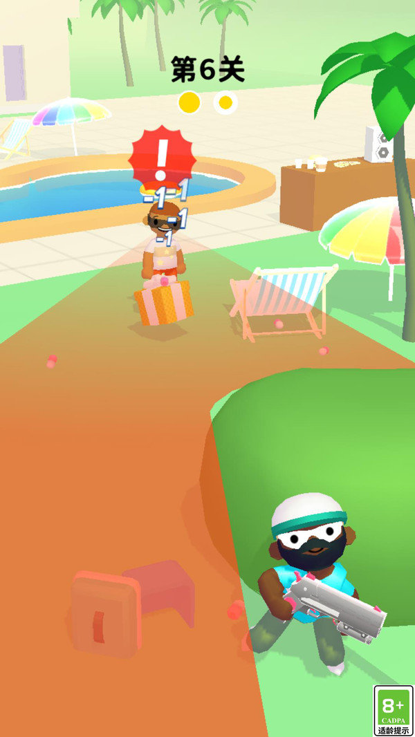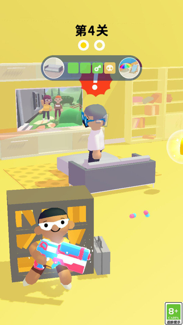 1、进入关卡后,玩家会隐藏在不同的桌椅后面,合适的时机点击屏幕对敌人进行整蛊。