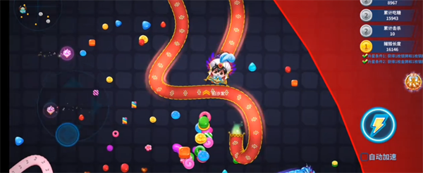 1、每条蛇都有自己独特的技能,你可以在无尽的混乱中释放技能,打败各种大蛇;