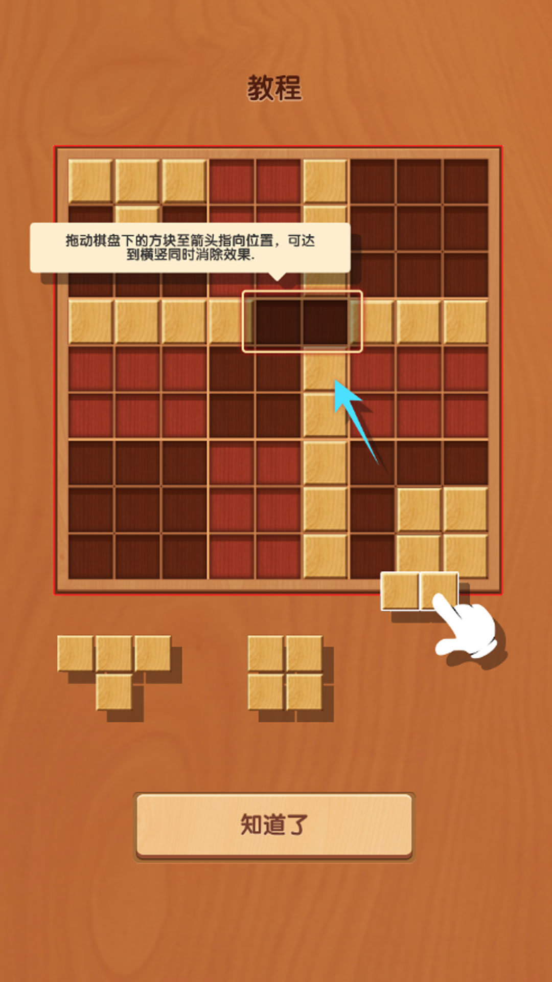 2、开局会有教程,拖动下方的方块至箭头位置,可以达到同时消除效果。