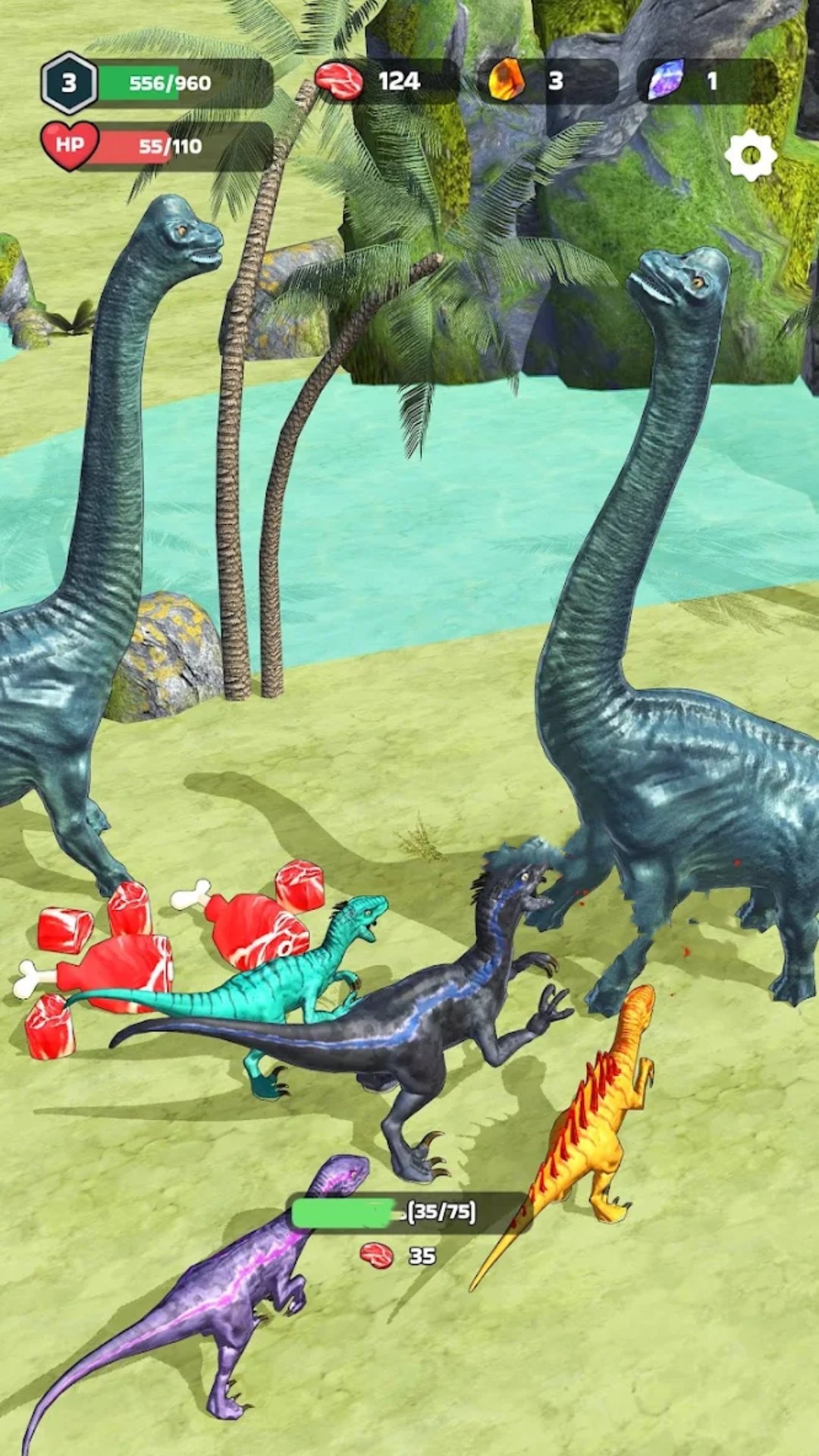 2、当遇到等级比自己低的恐龙时,通过发动快速攻击将其战胜,吃掉肉块来获取能量,从而稳步增强自身的实力并提升等级。