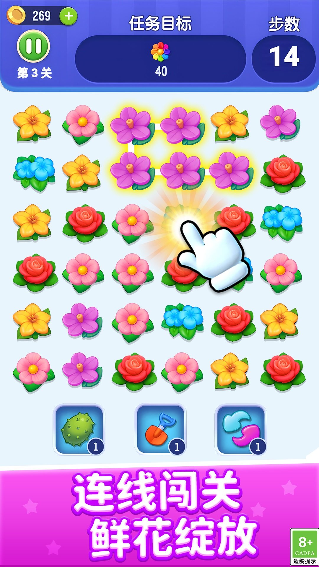 2、完成关卡指定消除的花朵数量即可过关,注意要在规定的步数内完成要求。