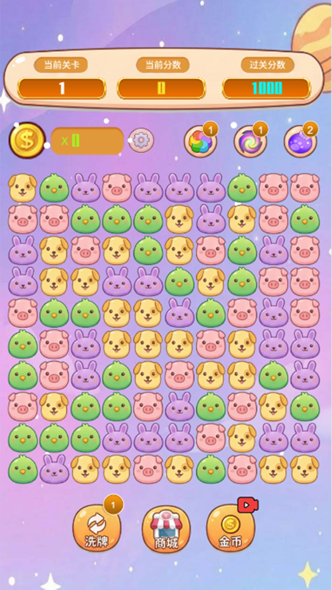 3、各种颜色可爱的图案,只要有三个连接在一起,就能点击消除。