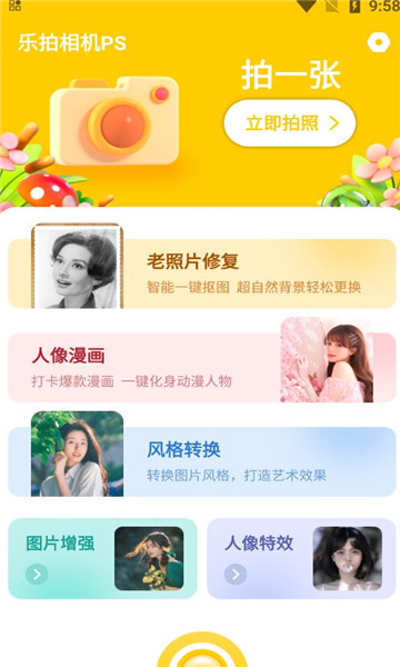 乐拍相机PS是一款功能全面的手机图片处理软件(LePai Camera PS),可以帮你修复老照片、人像漫画化、风格转换,还能增强照片效果。软件提供丰富的滤镜、贴纸和拼图功能,让每张照片都焕发新意。无论是日常拍照还是创意制作,都能轻松上手,快速打造理想照片。立即下载人像美化软件,开启你的创意摄影之旅吧!