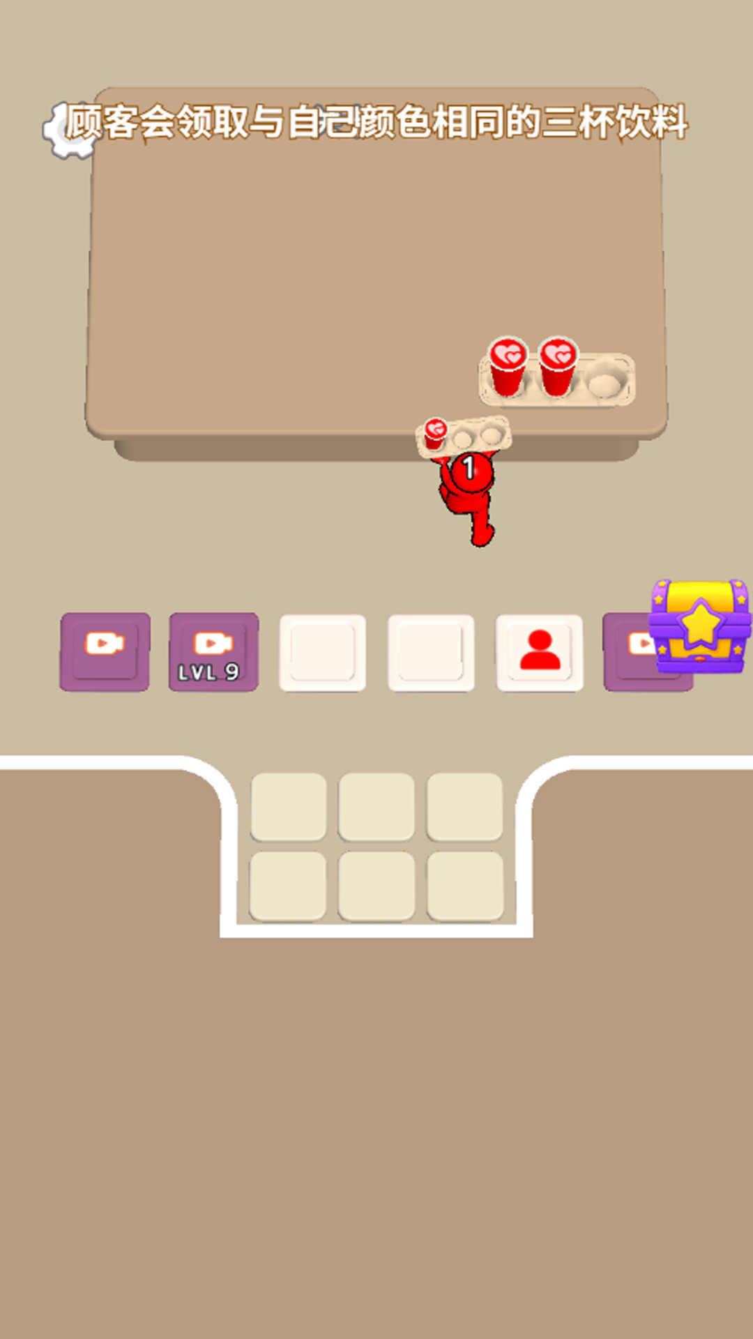 1、进入游戏后,点击顾客,顾客就会去领取三杯和自身颜色一致的饮料,只要成功领取到这三杯饮料,就能完成任务。