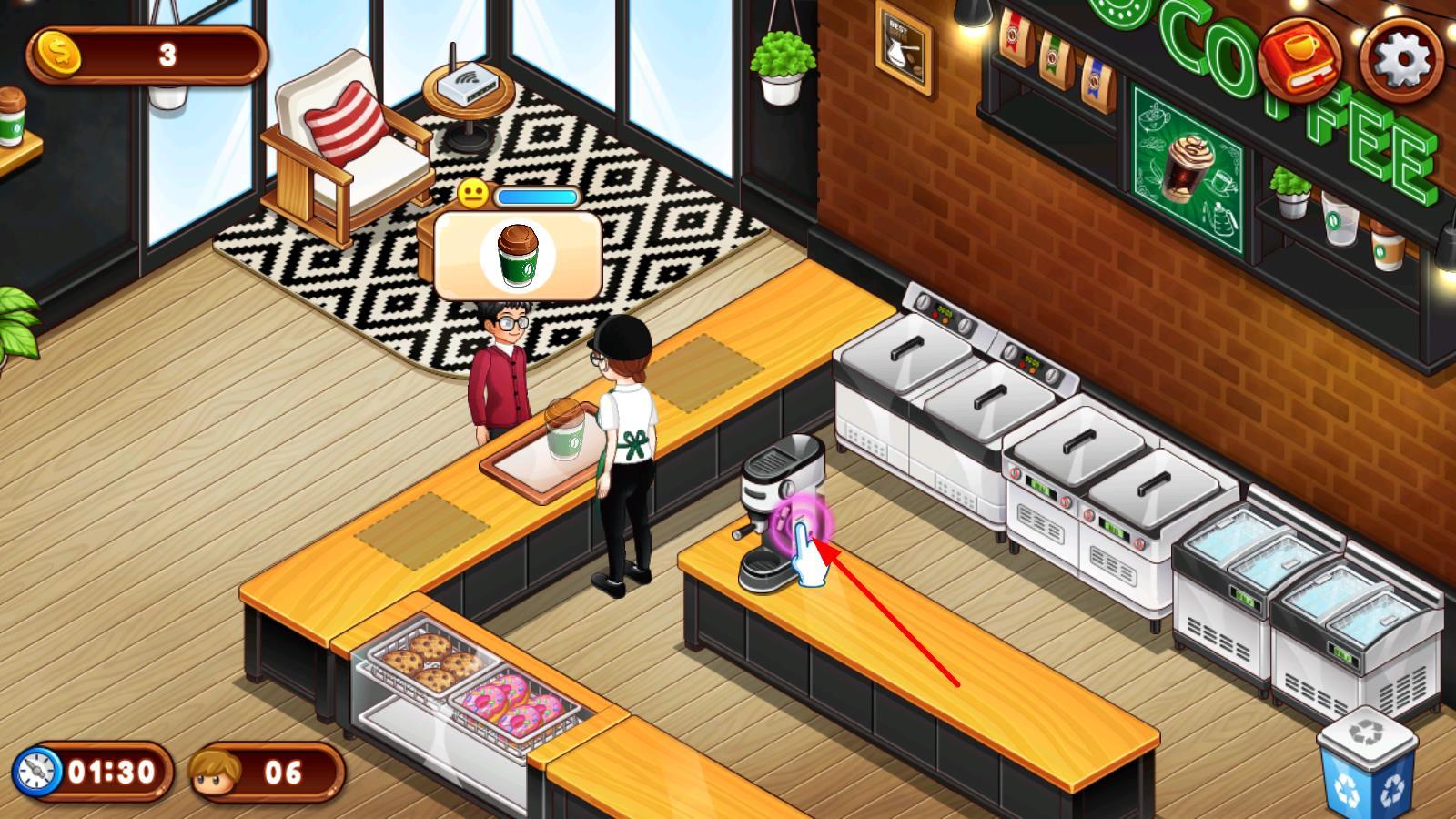 4、当咖啡制作完毕,点击制作好的咖啡,把它递交给相应的顾客,从而结束此次服务流程。