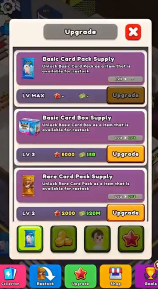 游戏里设计了丰富多样的挑战任务与成就系统,涵盖了从提升等级、解锁新货架,到收集特定卡片、升级现有货架等不同维度。这些充满趣味性的挑战不仅增强了游戏的可玩性,还能让玩家在完成过程中获取丰厚的奖励回馈。