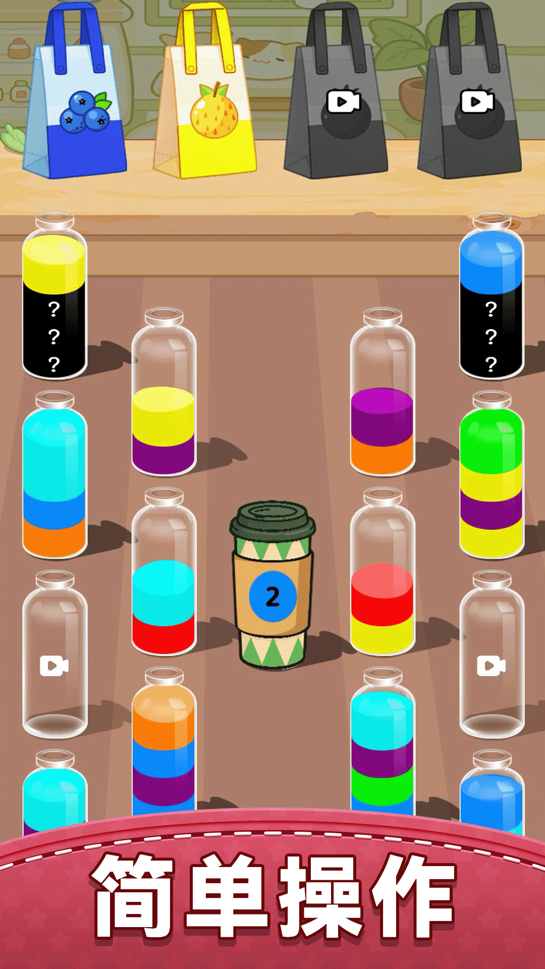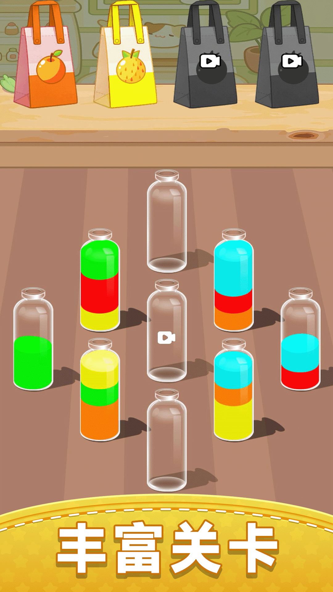 解压倒果汁,一款以解压为核心体验的倒果汁小游戏。非常适合作为日常减压神器来体验哦!规则简单上手即玩,通过倾倒液体让瓶子只装纯色,逻辑性强,非常解压的休闲模式,作为一款锻炼思维,治愈强迫症,非常适合大家来尝试!