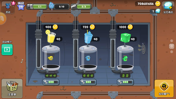 游戏分为两个板块,一个是捕获僵尸的板块还有一个是对于僵尸进行榨汁进行贩卖的板块。在对于僵尸进行榨汁贩卖的板块也有许多玩法设置。在玩家们捕获僵尸之后,是可以把僵尸制作成各种不同的僵尸食品进行销售的,不同的僵尸能够被制作成为不同的商品进行售卖。其中小编觉得最有意思的就是这个板块。随着售卖的僵尸商品越来越多,小伙伴们积累的金币也就越来越多,随之也就可以对装备进行升级与强化,更方便于玩家进行捕捉僵尸。在抓取僵尸的板块,首先会给予玩家僵尸探察机器,这种机器能够帮助玩家们探索到僵尸。