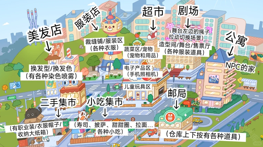 这里有房子、餐馆、工作场所、商店、咖啡馆、警察局、日托中心、宠物店、游乐场、学校、青年俱乐部(有图片!)等各色选择,你可以一一下载,也包括有趣的角色!