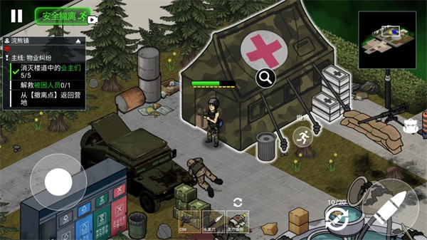 3、进入关卡后左边控制角色的移动,右边是换弹、射击和背包按钮,屏幕下方的是你的武器和治疗道具,右上角的是关卡地图,左上方的是你的任务。