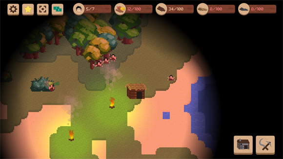 2、进入地图后点击右下角的房子按钮先建造一个火堆。