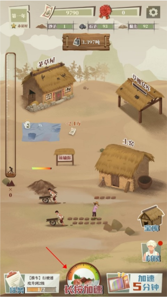 4、游戏模式采用放置挂机,期间你也可以通过点击底部的“长按加速”,持续加速,可大大加快挖掘速度。