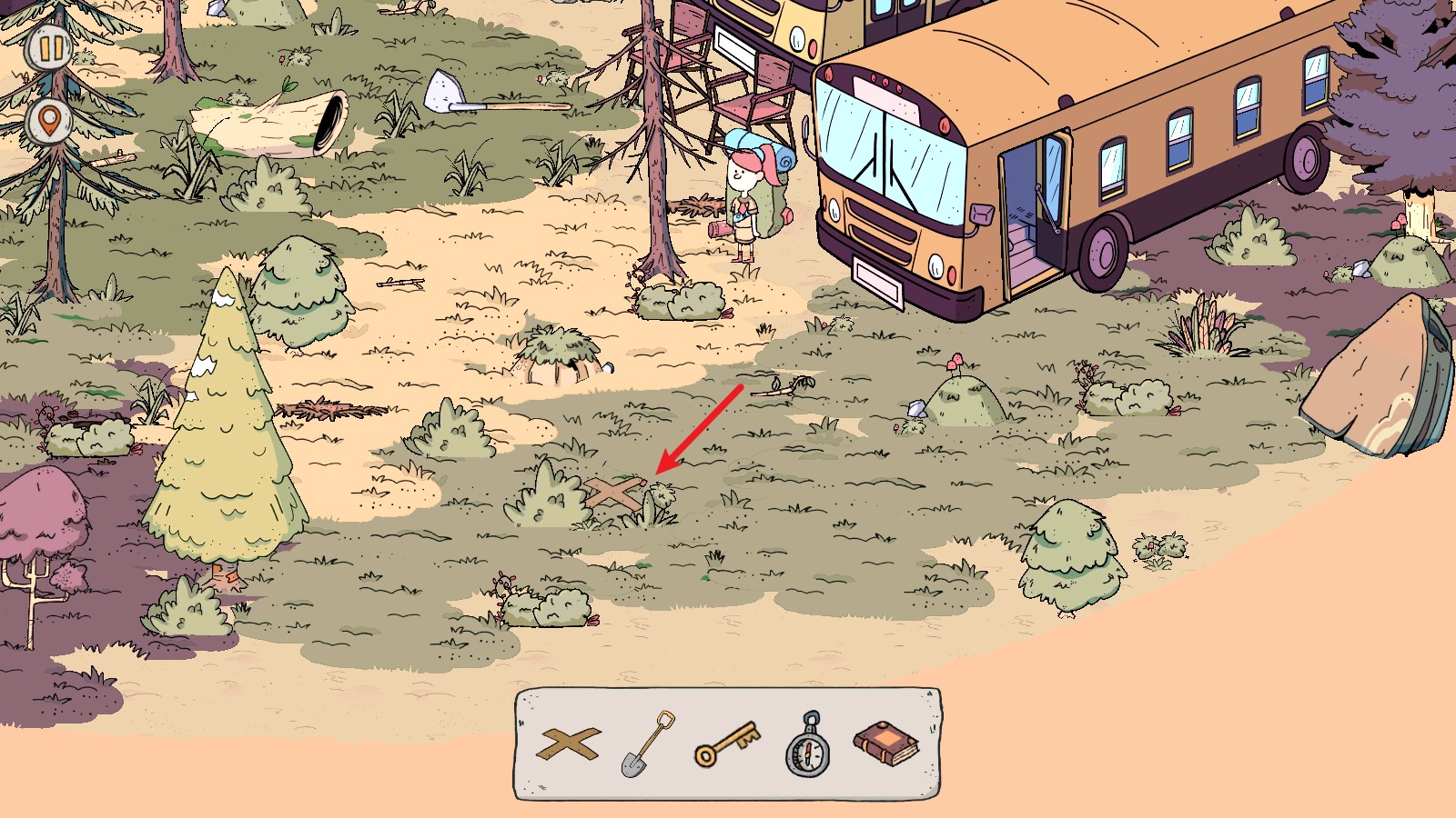 5、向上移动视角,可以在巴士旁边的土堆这里找到铁锹。