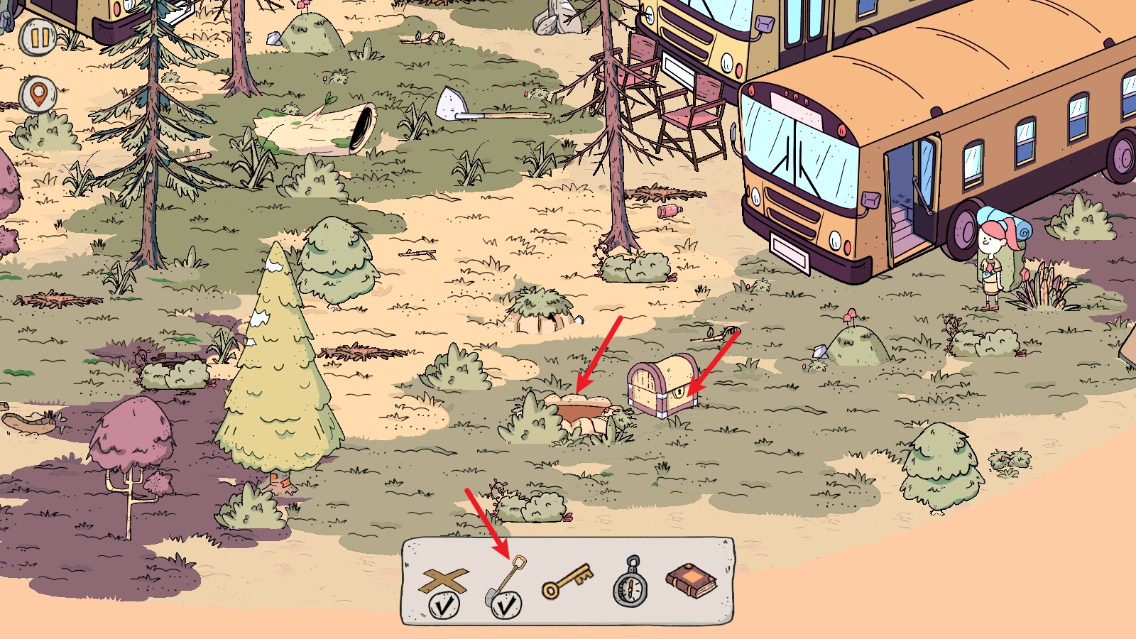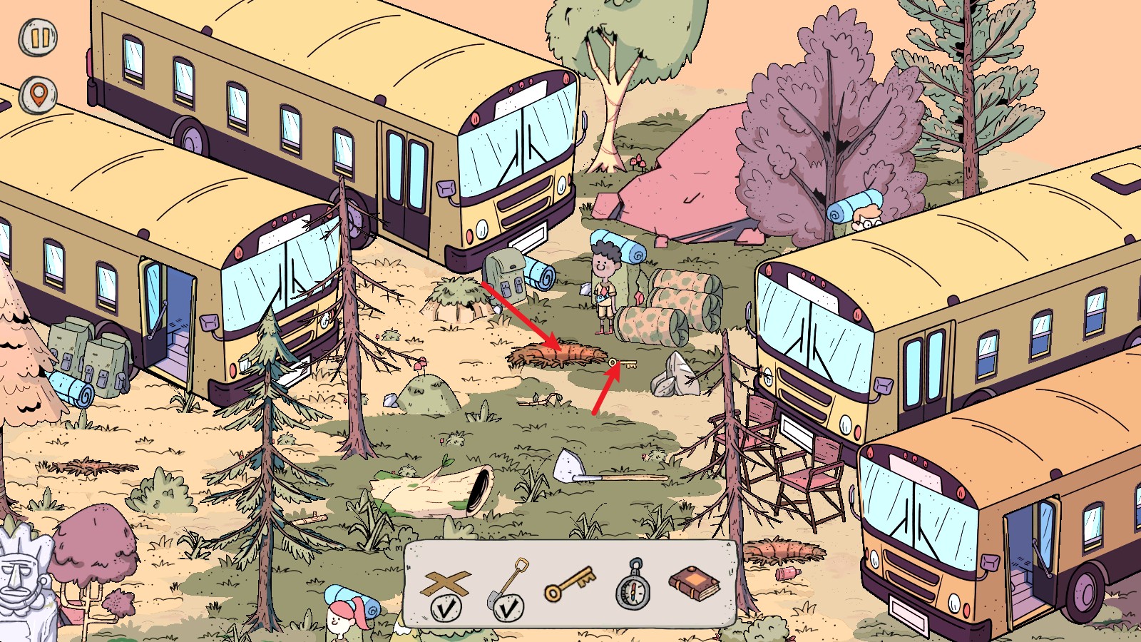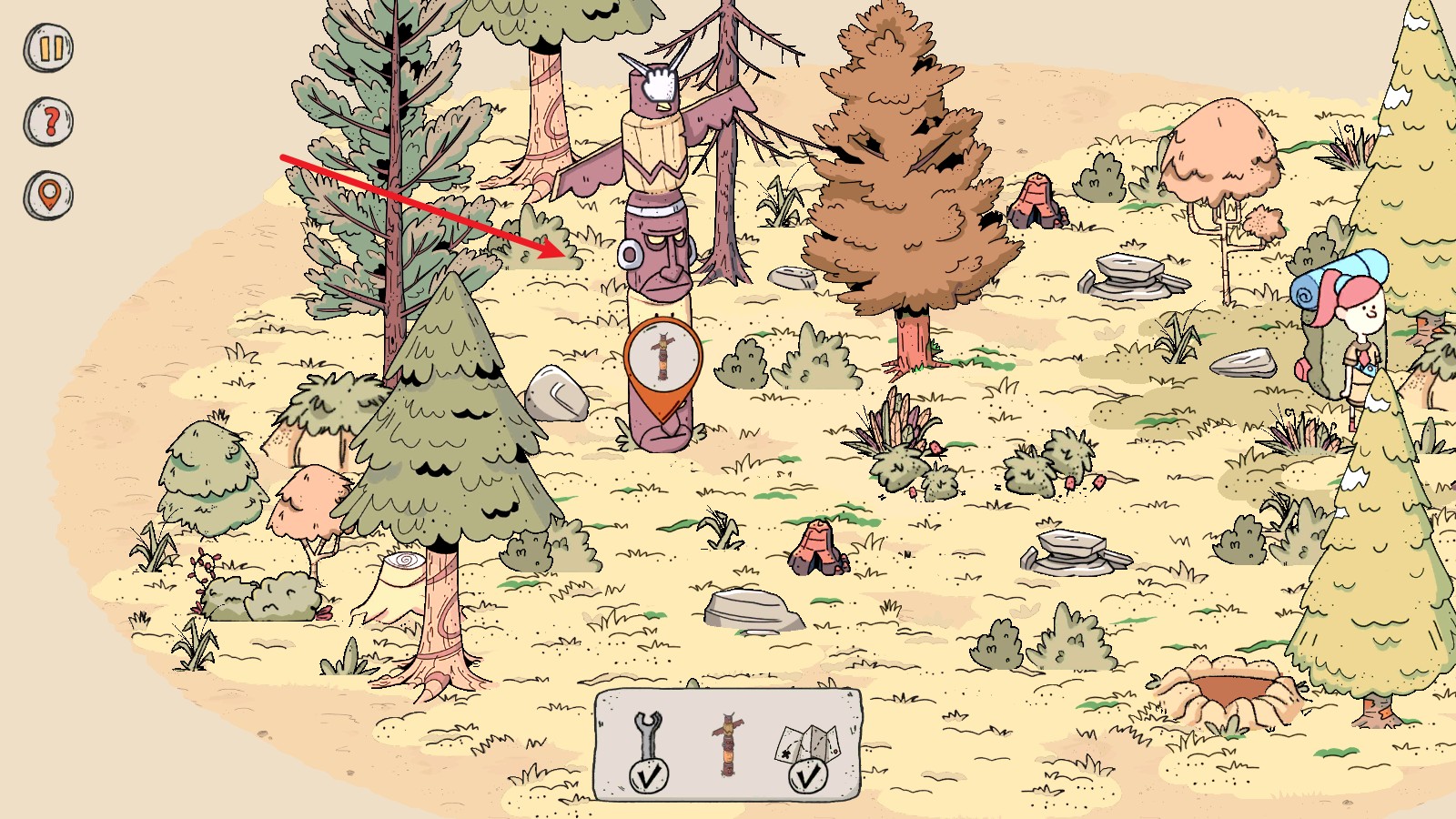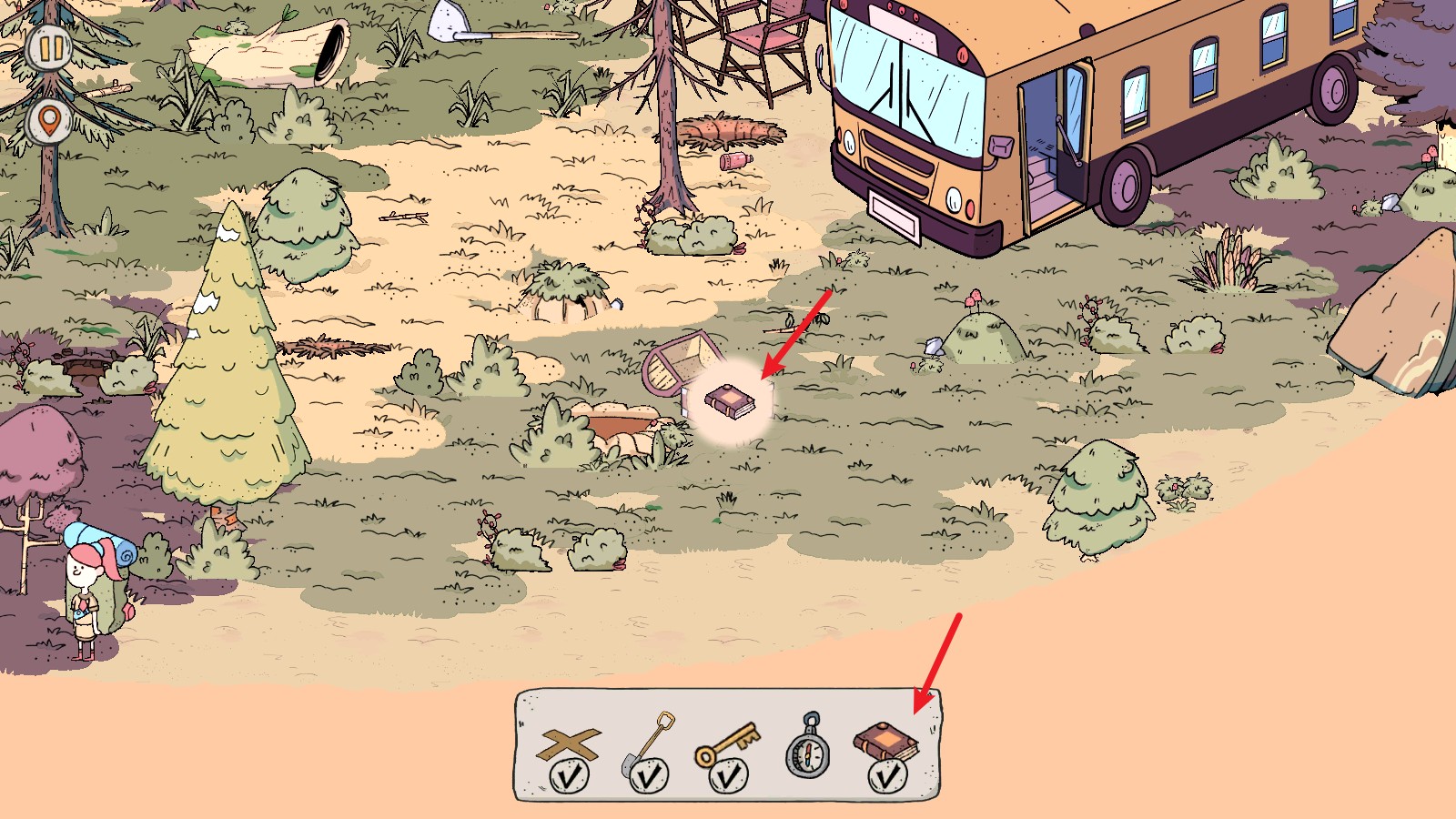 4、来到下一个场景,我们需要找到五件物品,首先点击这里的草丛可以找到这个标记。