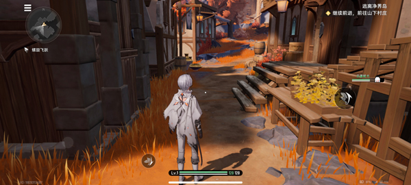 4、右上角显示着当前任务,操纵角色前往山下村庄;