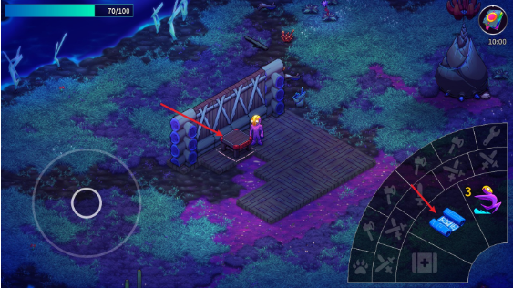 5、来到工作台这里,靠近工作台之后,攻击键就会变成一个卷轴,点击可以进入工作台。