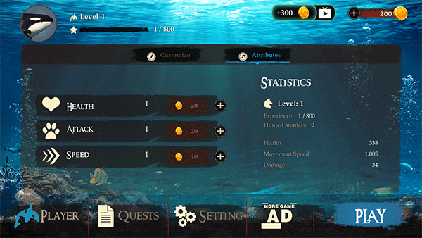 通过金币分配属性点,查看虎鲸详细数据后点击“Play”开始游戏。