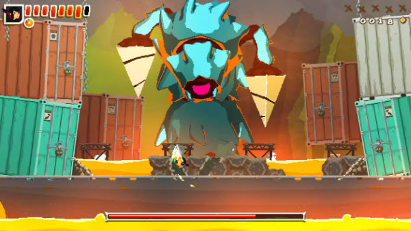 2、这场战斗则更富有挑战性,它会用手上的巨大钻头破坏地块形成岩浆区域。