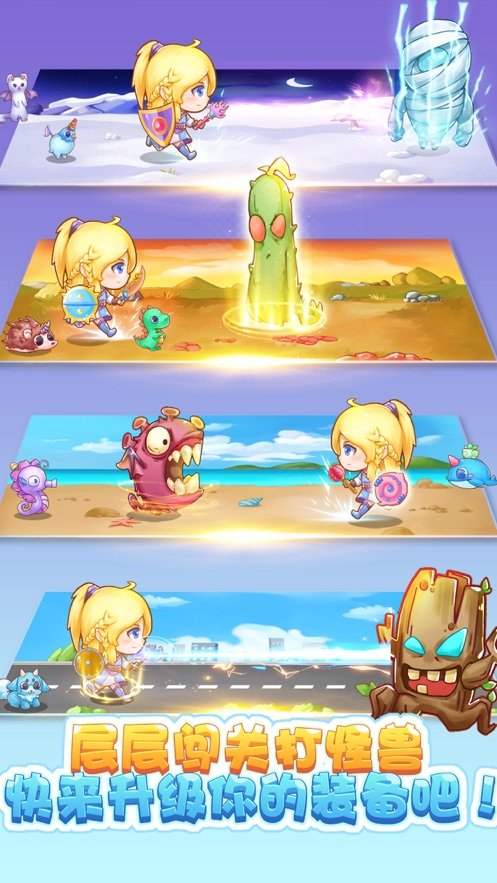 一人冒险是一款放置类的冒险游戏,游戏中美少女将带上她的宠物前去消灭入侵村庄的怪物,游戏采用合成的方式进行战斗,你需要把相同的武器合并成更加强大的武器,玩起来非常的轻松,只需要用手指点一点即可,怪物也会掉落很多奖励,你可以用于强化自己,并且这款游戏还支持离线挂机哦!