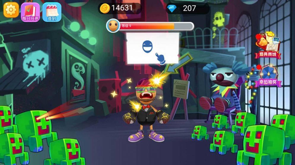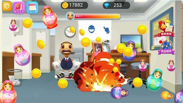 2、不同的道具组合每次击中均可收集金币和钻石,可以用来购买更具破坏性的滑稽武器。