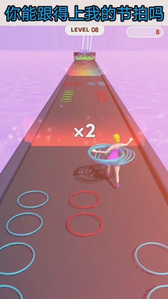 3、游戏中必须保持一边转呼啦圈一边冲刺的动作来完成挑战,身上的呼啦圈越多最后到达终点的时候分数越高。